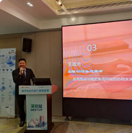 第三个分享环节由IT圈俱乐部创始人、谷云科技销售总监王晨光老师带来,主题是《AI驱动的集成革命——应用集成与数据集成中台的协同未来》。